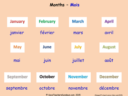 After this lesson you will be able to have a conversation about this topic. Can be printed, laminated and cut to size for a colourful and useful display! In french, the day of the month is always a cardinal number except for the first (le premier). This lesson can still be improved. Please, create one line per table with your language! Days and months display for a french classroom. You'll precede this with the definite article le (just as. This community is also open to talking about different ways to go about learning french, whether that. 1.days of the week in french. Fortunately, there are only seven! Learn to communicate meeting times and ticket dates using days of week and months of year french words. When talking about something that happens repeatedly on a particular day of the week so there you go with the days, months, and year in french. Samedi has some similarity in sound to saturday, and lundi is easy to connect to monday when we remember that moon is the basis of monday and that lune, being related to the english word lunar, is the root of lundi.