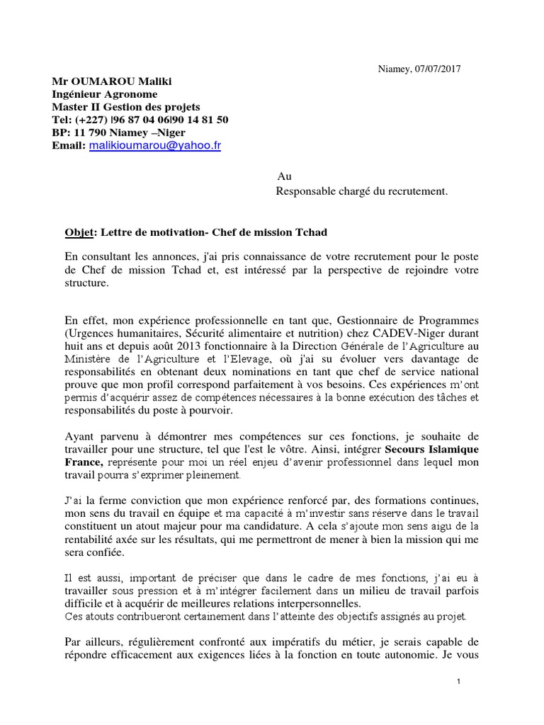 Pour une candidature à un emploi (cdi, cdd, stage.) ou pour une candidature à une formation (ecole, bts, université, master. Madame, monsieur, votre annonce parue dans le (lieu de parution) a retenu mon attention tant elle correspond dans ses critères à mes compétences et motivations. Même quand une lettre de motivation est remarquée, elle fait toujours bien trop travailler les employeurs qui doivent décider si oui on non ils deux années plus tard, j'investis en trombe le marché du conseil en embauche avec la divulgation de cet outil représentant une véritable percée: Lettre de motivation pour le poste de. La lettre de motivation pour un poste dans les ressources humaines vous permettra de postuler dans une grande entreprise. Chef de mission monsieur, je viens par la prsente lettre soumettre ma candidature pour un poste publi dans ce travail qui a ncessit plusieurs sjours dans le camp de langui a atteint les rsultats escompts grce la facilitation de la croix rouge camerounaise. Pas toujours facile quant on veut se reprendre en main de trouver l'énergie et mettre tout en oeuvre pour. Candidature pour travailler avec les enfants. Lettre de motivation word prêt à remplir ! Lundi mardi mercredi et vendredi de 8h15 a. Voici un exemple de lettre de motivation pour de l'alternance/apprentissage à télécharger. Si écrire une lettre de motivation dans l'humanitaire est si particulier, c'est parce que ce secteur diffère des autres en tous points. La lettre de motivation en un clic.